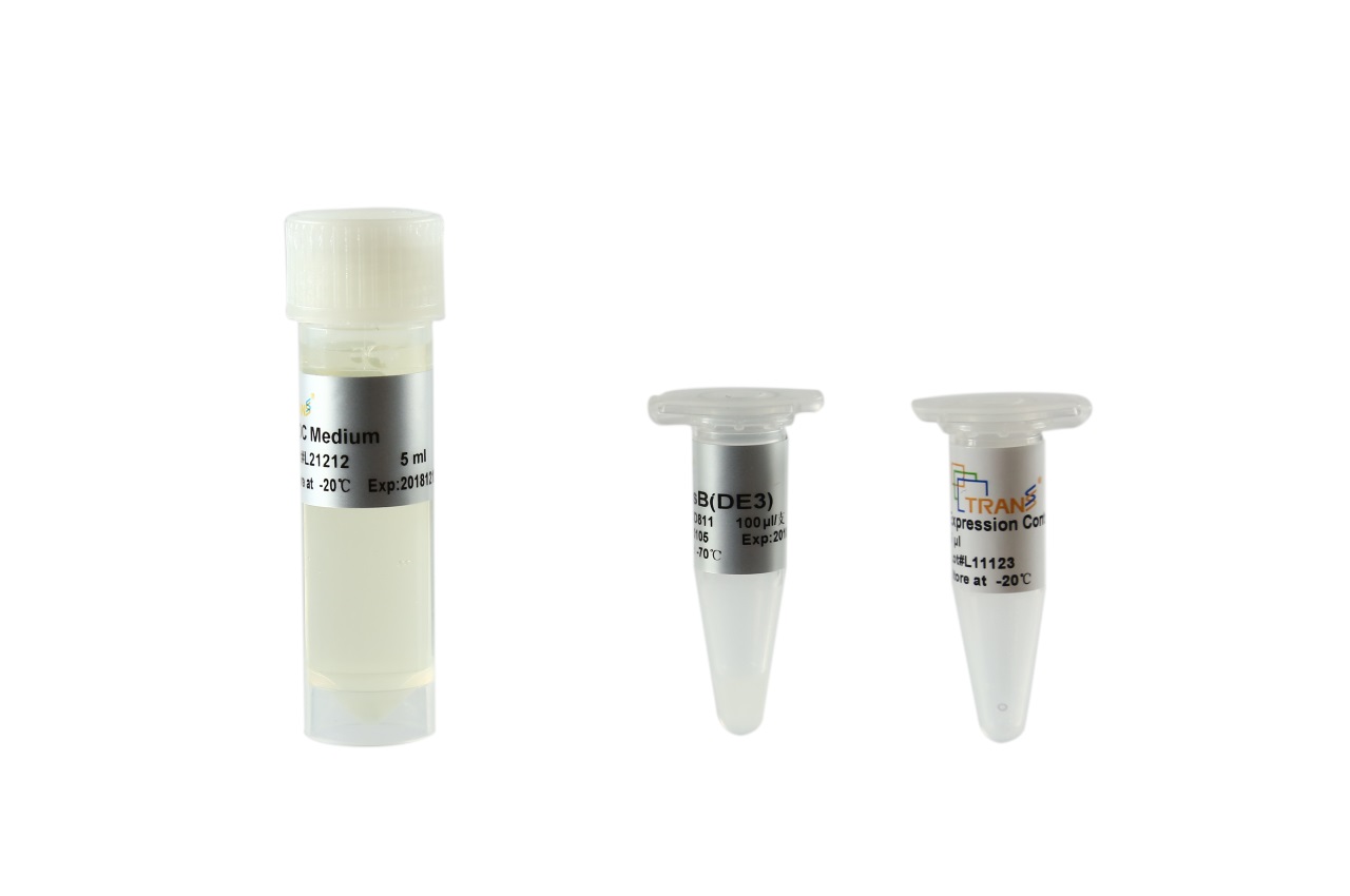 TransB(DE3) 化學(xué)感受態(tài)細胞經(jīng)特殊工藝制作,可用于DNA 的化學(xué)轉(zhuǎn)化。細胞具有卡那霉素(KanR) 和四環(huán)素(TetR) 抗性。使用pUC19 質(zhì)粒DNA 檢測,轉(zhuǎn)化效率可達107 cfu/μg DNA。使用Control Plasmid I (Amp+) 用于檢測細胞是否具有表達功能,表達蛋白大小為25 kDa。