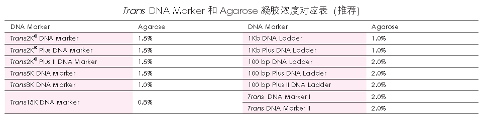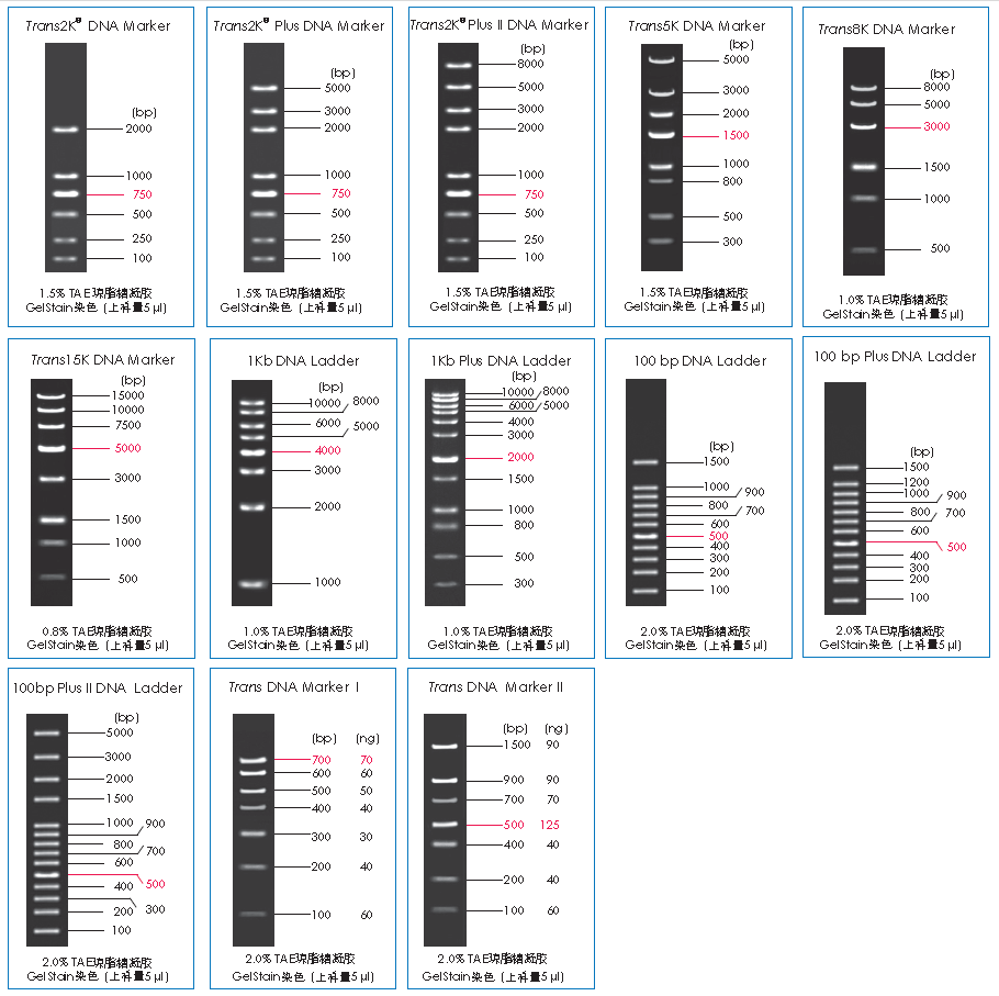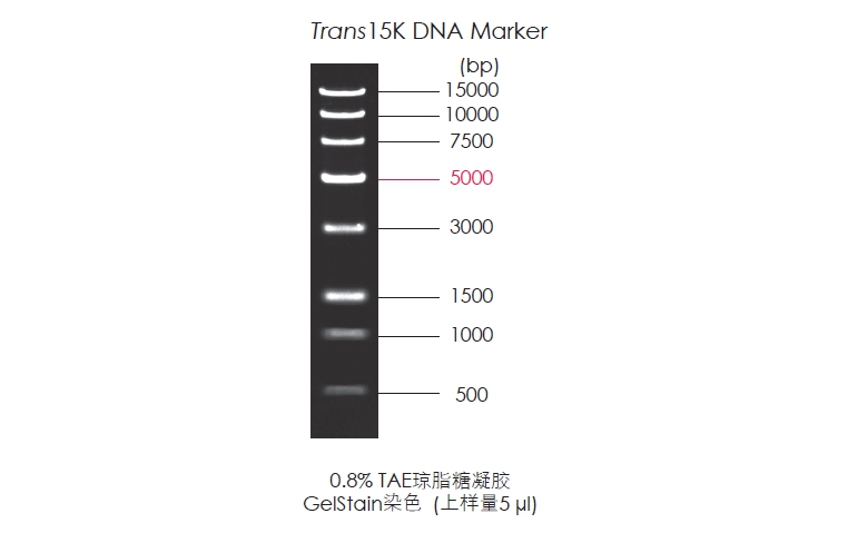 Trans15K DNA Marker由8條線狀雙鏈DNA條帶組成,適用于瓊脂糖凝膠電泳中DNA條帶的分析,不建議用于聚丙烯酰胺凝膠電泳。本產(chǎn)品為即用型產(chǎn)品,已含有1×Loading Buffer,可根據(jù)實(shí)驗(yàn)需要,直接取5 μl電泳,使用方便,電泳圖像清晰。其中5000 bp條帶濃度為100 ng/5 μl,顯示亮帶,其余條帶濃度均為50 ng/5 μl。