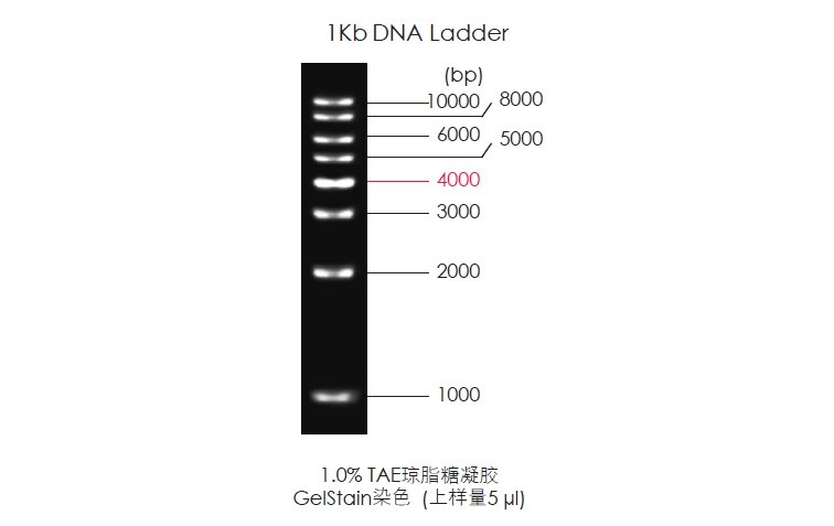 1 Kb DNA Ladder是由8條線狀雙鏈DNA條帶組成,適用于瓊脂糖凝膠電泳中DNA條帶的分析,不建議用于聚丙烯酰胺凝膠電泳。本產(chǎn)品為即用型產(chǎn)品,已含有1×Loading Buffer,可根據(jù)實(shí)驗(yàn)需要,直接取5 μl電泳,使用方便,電泳圖像清晰。其中4000 bp條帶為100 ng/5 μl,顯示亮帶,其余條帶濃度為50 ng/5 μl。