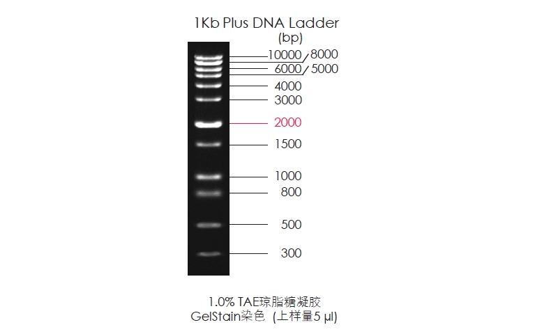 1 Kb Plus DNA Ladder是由12條線狀雙鏈DNA條帶組成,適用于瓊脂糖凝膠電泳中DNA條帶的分析,不建議用于聚丙烯酰胺凝膠電泳。本產(chǎn)品為即用型產(chǎn)品,已含有1×Loading Buffer,可根據(jù)實(shí)驗(yàn)需要,直接取5 μl電泳,使用方便,電泳圖像清晰。其中2000 bp條帶為100 ng/5 μl,顯示亮帶,其余條帶濃度為50 ng/5 μl。便于準(zhǔn)確判斷目的產(chǎn)物DNA的量。