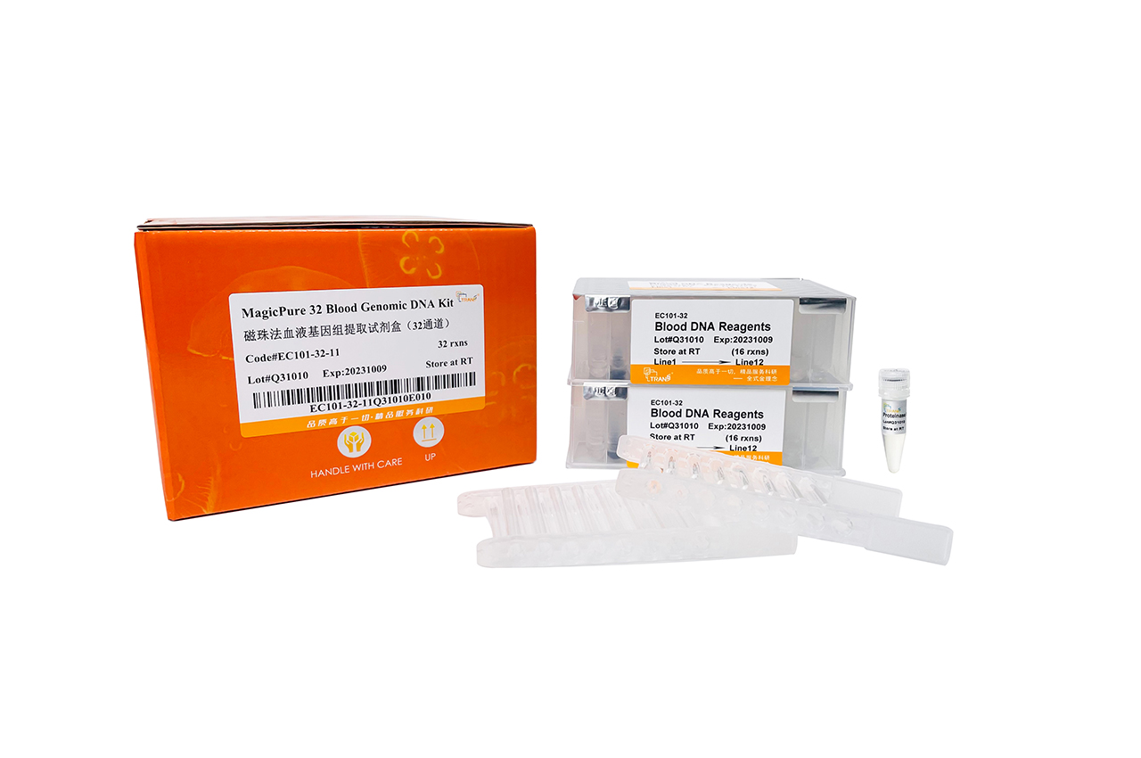 本試劑盒采用酶解法裂解血液,利用硅基磁珠特異地吸附DNA,硅基磁珠在緩沖體系中對目的DNA具有很強的磁吸附力,當(dāng)離子強度發(fā)生改變時,磁珠釋放吸附的DNA從而達到快速分離純化DNA的目的。本試劑盒適用于從50-250 μl新鮮、冷凍或加入抗凝劑血液中高效地提取基因組DNA。所得產(chǎn)物純度高,適用于酶切、PCR、qPCR和Southern Blot等實驗。本試劑盒適用于32通道磁棒式自動化核酸提取儀。