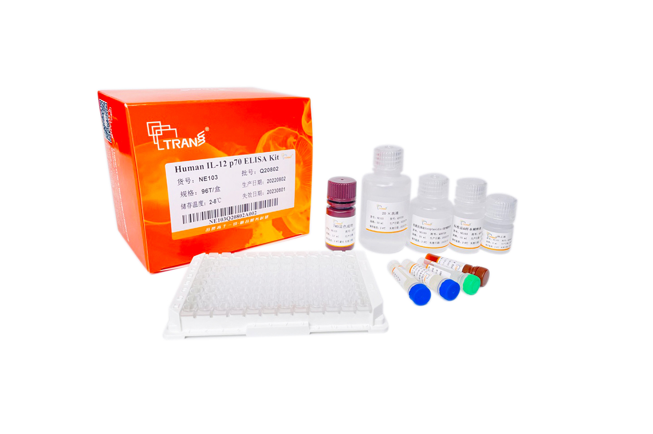 本試劑盒采用雙抗體夾心ELISA法定量測定人血清和血漿中的IL-12 p70含量。本試劑盒采用高親和力的抗人IL-12 p70抗體預(yù)包被酶標(biāo)板,將標(biāo)準(zhǔn)品/待測樣本加入微板孔中,經(jīng)過孵育后樣本中存在的IL-12 p70會與酶標(biāo)板上的預(yù)包被抗體特異性結(jié)合。洗滌去除未結(jié)合物后,將生物素標(biāo)記的抗人IL-12 p70檢測抗體加入微板孔中,再次孵育后檢測抗體會與錨定在酶標(biāo)板上的IL-12 p70特異性結(jié)合。隨后,將辣根過氧化物酶標(biāo)記的鏈霉親和素(Streptavidin-HRP)加至微孔板中并孵育,通過檢測抗體上的生物素和鏈霉親和素發(fā)生的高強(qiáng)度非共價結(jié)合,形成“包被抗體-人IL-12 p70蛋白-檢測抗體-Streptavidin-HRP”免疫復(fù)合物。再次洗滌后,將顯色底物TMB加至微板孔中,HRP會催化TMB底物生成藍(lán)色產(chǎn)物,顏色反應(yīng)的深淺將與樣本中IL-12 p70的濃度成正相關(guān)。而后加入終止液終止反應(yīng),在450 nm波長(參考波長570 - 630 nm)處測定吸光度值。通過繪制標(biāo)準(zhǔn)曲線,由樣本吸光度值可計(jì)算出樣本中所含IL-12 p70濃度。本試劑盒特異性強(qiáng)、檢測靈敏度高,同時操作更加便捷。
