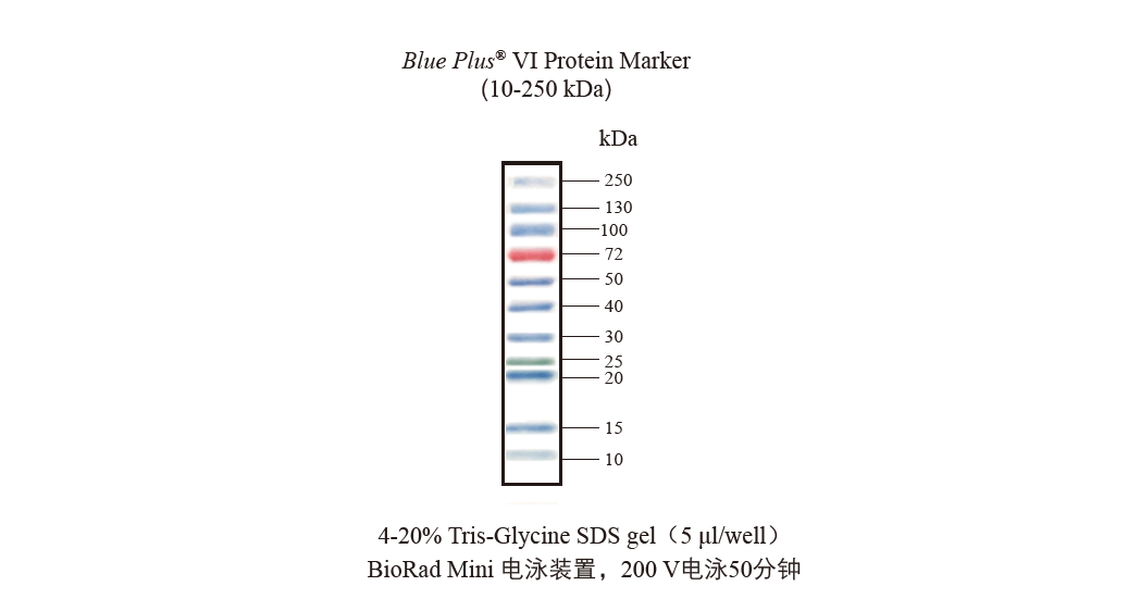 本產(chǎn)品由11種預(yù)染蛋白質(zhì)組成,分子量范圍為10 kDa-250 kDa。其中72 kDa為橙色條帶,10 kDa、15 kDa、20 kDa、30 kDa、 40 kDa、50 kDa、100 kDa、130 kDa、250 kDa為藍(lán)色條帶,25 kDa為綠色條帶,可以動態(tài)觀察蛋白質(zhì)電泳狀態(tài)及清晰地判斷蛋白轉(zhuǎn)膜效果。經(jīng)SDS-PAGE電泳后轉(zhuǎn)移到PVDF或NC膜上可見清晰的彩色條帶。橙色條帶和綠色條帶可以方便地判斷轉(zhuǎn)膜的方向。