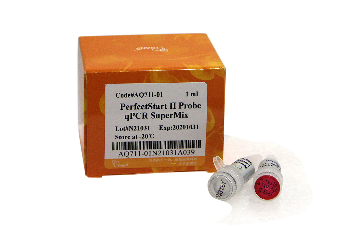 PerfectStart? II Probe qPCR SuperMix利用在PCR體系中加入熒光探針 (TaqMan或Molecular Beacon等),擴(kuò)增過程中其 熒光量與擴(kuò)增產(chǎn)物量成正比,通過熒光量的檢測測定樣本核酸量。本產(chǎn)品含PerfectStartTM Taq熱啟動酶 (利用3種單克 隆抗體與Taq DNA Polymerase高效結(jié)合,有效地封閉了DNA聚合酶活性,阻止了低溫下的非特異性擴(kuò)增)、特殊優(yōu)化的qPCR反應(yīng)緩沖液、dNTPs、PCR增強(qiáng)劑、穩(wěn)定劑。本產(chǎn)品濃度為2×,使用時只需加入模板、引物、探針、Passive Reference Dye (根據(jù)qPCR儀選擇) 和水,使其工作濃度為1×,即可進(jìn)行反應(yīng)。