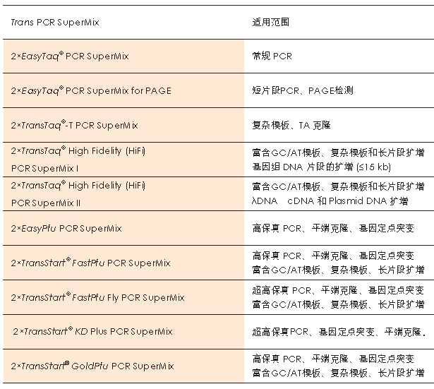 本產(chǎn)品含TransStart? KD Plus DNA Polymerase、dNTPs和優(yōu)化的反應緩沖液,濃度為2×,擴增能力強,擴增速度快,具有超高保真性、高特異性。DNA擴增時,只需加入模板、引物和水,使SuperMix溶液的濃度為1×即可進行反應。擴增產(chǎn)物為平端,可直接克隆于pEASY?-Blunt系列載體中。