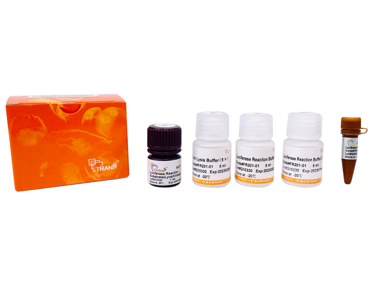 螢火蟲熒光素酶 (firefly luciferase)和海腎螢光素酶(Renilla luciferase)可分別催化熒光素 (luciferin)或腔腸素 (coelenterazine) 氧化形成oxyluciferin或coelenteramide ,并在此過程中產(chǎn)生生物熒光。TransDetect? Double-Luciferase Reporter Assay Kit首先以熒光素為底物檢測螢火蟲熒光素酶報告基因的活性,之后在淬滅該熒光反應(yīng)的同時,以腔腸素為底物檢測海腎熒光素酶報告基因的活性,具有檢測迅速、靈敏度高、檢測范圍廣、無細(xì)胞內(nèi)源活性干擾等特點。