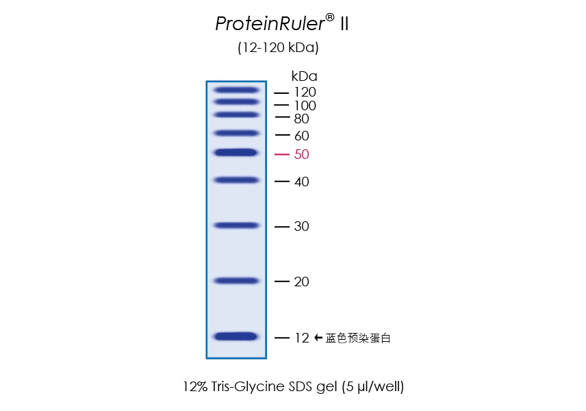 ProteinRuler? II由9種重組蛋白質(zhì)組成,分子量范圍為12 kDa-120 kDa。經(jīng)SDS-PAGE電泳后,用考馬斯亮藍(lán)染色可見清晰的9條帶。12 kDa為藍(lán)色預(yù)染蛋白,便于動(dòng)態(tài)觀察蛋白質(zhì)電泳狀態(tài)。50 kDa為加亮條帶,便于分子量鑒定。
